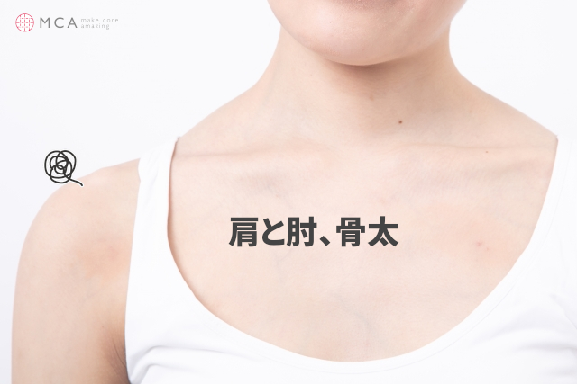 1つ目の原因である鎖骨だけでなく肩や肘もしっかりして見えるので、それが骨太につながり二の腕も太く見えてしまうんです。